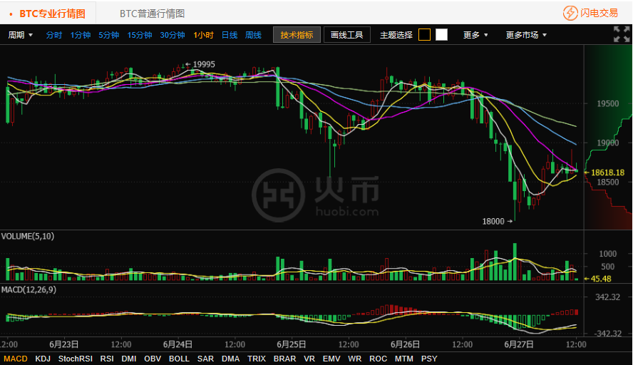看火幣網(wǎng)比特幣行情小時(shí)圖。自昨日下午 14 時(shí),火幣網(wǎng)比特幣價(jià)格跌破前期震蕩的平臺(tái),再次形成探底走勢(shì),成交量有效放大,跌至 18000 元以后有所反彈,但從反彈力度看,成交量較小,表白多頭反撲力量有限。今日上午兩次拉升探至 18900 元附近止步,在該位置形成短期壓力位。行情依舊沒(méi)有企穩(wěn)跡象,嚴(yán)格控制風(fēng)險(xiǎn)。火幣網(wǎng)溫馨提示:投資有風(fēng)險(xiǎn),入市需謹(jǐn)慎。