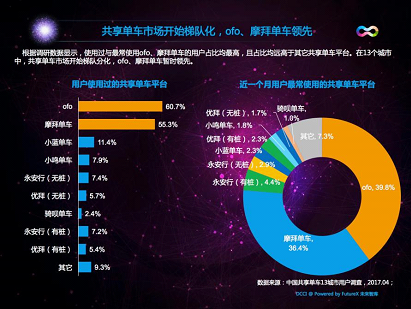按照另一第三方權威數據機構DCCI的《中國共享單車 13 城市用戶研究陳訴》,ofo以39.8%的絕對優勢成為用戶使用頻次最高的共享單車,穩居行業第一。