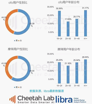 在用戶群的畫像方面,在代表未來的18- 24 歲年齡段的年輕用戶中,ofo占30.36%,摩拜單車為25.25%,可以看出,ofo的年輕用戶明顯多于摩拜單車,最受年輕用戶群體歡迎。獵豹智庫認為,ofo多元化的產品特性吸引了不少年輕用戶,好比除了主打車型外,ofo還投放了公主車、肌肉車以及與700bike聯合推出一系列新穎車型。