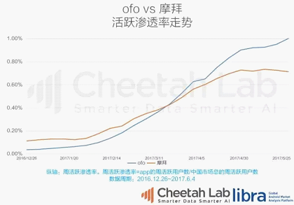 獵豹全球智庫發布的數據顯示, 2017 年 3 月之前摩拜活躍滲透率始終領先于ofo,直到本年 3 月開始,ofo活躍滲透率增速更為明顯,且開始持續大幅度領先摩拜單車,至今領先優勢十分明顯,且呈現出強勁的增長態勢。活躍滲透率更高,意味著比擬摩拜,有更多的用戶使用ofo。從最新數據來看,摩拜活躍滲透率增速在 4 月之后明顯較為遲緩。