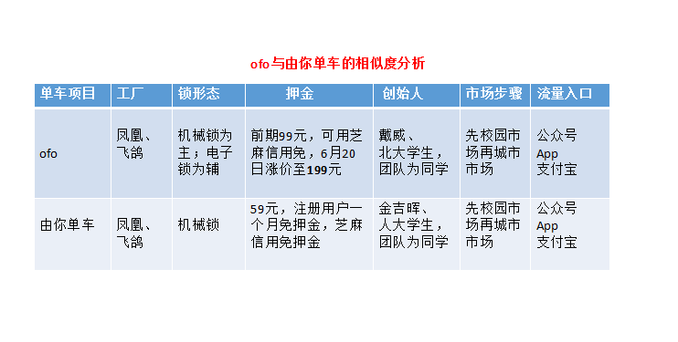 阿星在本年四月騎行由你單車時,就發現由你與小黃車的高度相似性,二者均是通過微信公眾號輸入單車的車牌號開啟或掃碼開啟,配置的是機械鎖。據了解,由你單車創始人金吉暉是人大學生, ofo創始人戴威也是北大學生;由你單車第一批投放是在人大校園,而ofo起源于北大校園。二者之間差距主要是在車輛顏色和押金額度上。