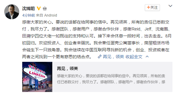 鈦媒體快訊 | 6月23日消息:LinkedIn全球CEO Jeff Weiner在給中國員工內部信中頒布頒發,領英中國總裁沈博陽于6月30日起將不繼續擔任此職務,在找到沈博陽的長期繼任者之前,領英國際工程團隊的負責人曾志恒將代理中國總裁一職。