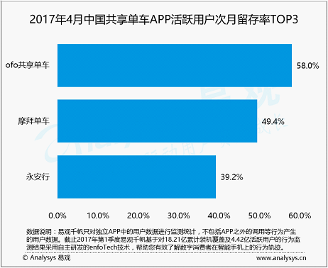 按照第三方權威數據機構易不雅觀陳訴顯示,本年 4 月,ofo小黃車APP活躍用戶次月留存率達到58.0%,領先于摩拜單車和永安行,排名行業第一。摩拜單車在活躍用戶次月留存率這項指標上,依然是一成不亂的行業第二。