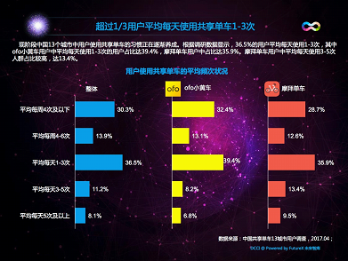 實際上,ofo小黃車一直以用戶體驗至上,為用戶提供最好的辦事,這也使ofo獲得了第三方數據評價的大滿貫。而摩拜單車在各類第三方機構的研究數據中,一直是不亂的行業老二。國內第三方權威互聯網數據機構DCCI最新發布了《中國共享單車 13 城市用戶研究陳訴》。DCCI研究陳訴顯示,ofo以80.7%的市場認知度位居行業第一位置,摩拜的市場認知度為74.5%,排名第二,小藍單車市場認知度為30.4%,排名第三。別的,36.5%的用戶平均每天使用共享單車1- 3 次,其中