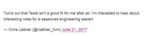 Chris Lattner推文顯示:“事實證明,特斯拉對我來說不太合適。”