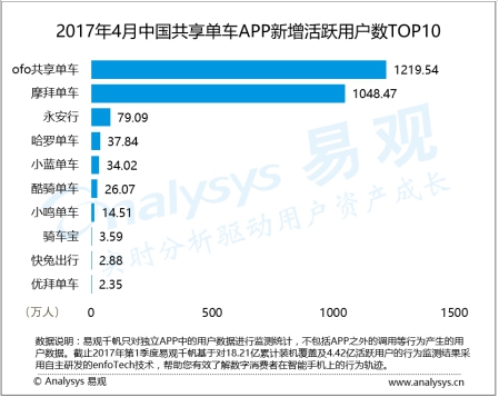 按照第三方權(quán)威數(shù)據(jù)機構(gòu)易不雅觀發(fā)布的最新數(shù)據(jù), 2017 年 4 月,ofo小黃車APP新增活躍用戶數(shù)為1219. 54 萬人,排名行業(yè)第一。不但如此,ofo小黃車的新增活躍用戶數(shù)超過摩拜單車、永安行、哈羅單車、小藍單車的總和,ofo共享單車“一哥”的地位實在是無法撼動。