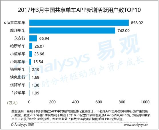 別的,易不雅觀 3 月數據也顯示,ofo新增用戶數同樣遠超摩拜單車及永安行新增用戶的總和。其中,ofo新增用戶數858. 02 萬人排名第一,摩拜單車新增用戶數為742. 09 萬人、永安行新增用戶數為66. 94 萬,ofo已連續兩個月連結新增用戶數排名行業榜首,霸主地位已愈發安靖,摩拜依舊穩居行業第二。