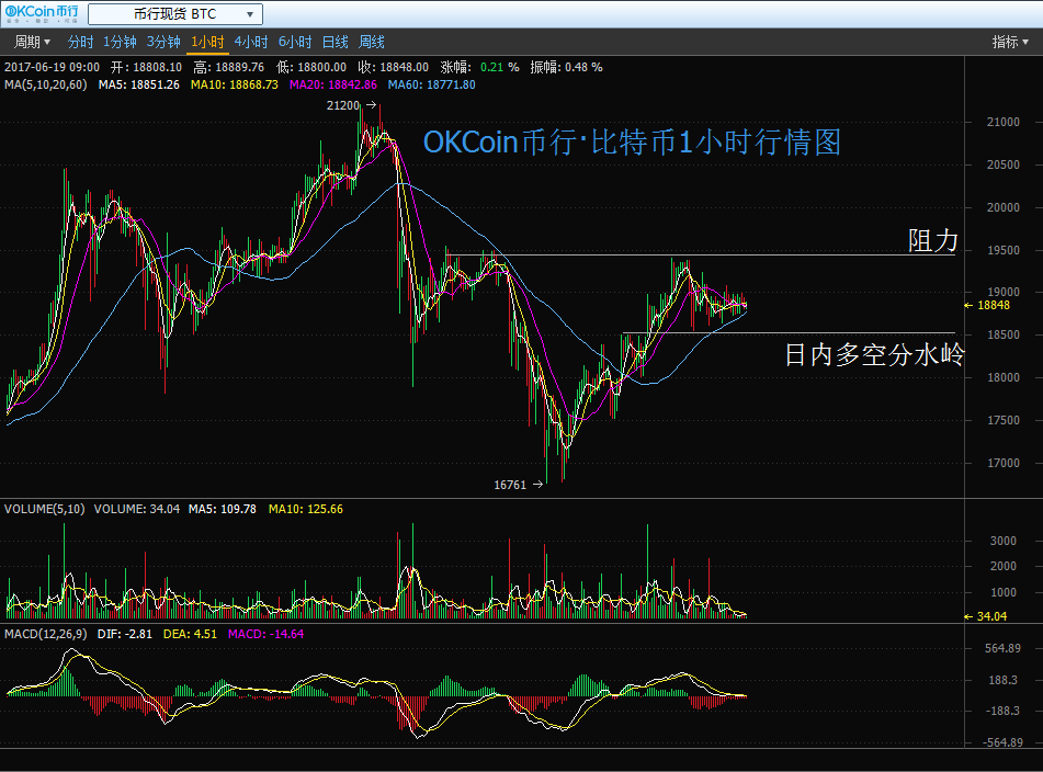按照國(guó)內(nèi)知名數(shù)字資產(chǎn)交易平臺(tái)OKCoin幣行數(shù)據(jù)顯示,周末兩天比特幣走勢(shì)并未出現(xiàn)大的顛簸,昨天價(jià)格全天呈現(xiàn)弱勢(shì)震蕩格局,開(kāi)市后在 19300 高位區(qū)短暫整理后震蕩下行,基本在18600- 19400 區(qū)間內(nèi)小幅震蕩。 19 日凌晨,比特幣開(kāi)盤價(jià)格18982,基本平開(kāi)。截至上午 10 點(diǎn)擺布,在 18800 一線浮動(dòng)。