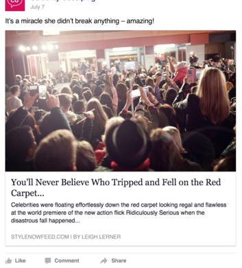 和國內很多自媒體平臺一樣,Facebook上也有不少標題黨。好比When She Looked Under Her Couch Cushions And Saw THIS…(她往沙發墊下看了一眼,結果發現了這個……)、WOW! Ginger tea is the secret to everlasting youth. You’ve GOT tosee this!(震驚!姜茶是連結年輕的奧秘,不看絕對后悔!)等。這些內容,大多是在標題上聳人聽聞,點進去發現不過是很普通的新聞或知識,用戶更多是感到欺騙和失落。