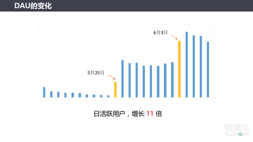 在當天的案例演示中,劉進提供了三張用戶活躍度表格,別離是注冊用戶量、日活躍用戶與成交單量,可以看到柱狀圖中,5 月 25 日與 6 月3 日的起伏較大。