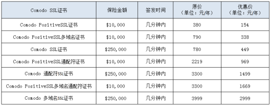 Comodo在業內以高性價比著稱,價廉質高并且產品類型多,,提供OV證書、EV證書和DV證書等類型證書,以滿足各類網站的安適需求。EV證書、OV證書價格較貴,但是保險金額相應較高,對網站的保障性較強,特別適合對網站安適要求高的金融,電商等網站。但如果您想給內部測試的域名,或者是博客網站安置安適證書,Comodo DV型(域名型)證書則是您的不二之選。DV證書專注于加密,采用與其他貴價證書同等水平的加密方法,掩護網站,訪客的信息安適,防止網站遭遇黑客攻擊。以下是部分熱門Comodo SSL證書詳情。