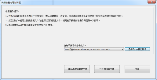 在“微信恢復(fù)向?qū)А睂?duì)話框中,如下圖點(diǎn)擊“一鍵導(dǎo)出微信數(shù)據(jù)文件”按鈕開始導(dǎo)出微信數(shù)據(jù)文件,導(dǎo)出過程需要一點(diǎn)時(shí)間,完成后會(huì)提示成功信息。接下來在“微信恢復(fù)向?qū)А睂?duì)話框中,點(diǎn)擊“打開微信庫文件”按鈕,就能查看被雙擊的微信用戶的聊天記錄了。