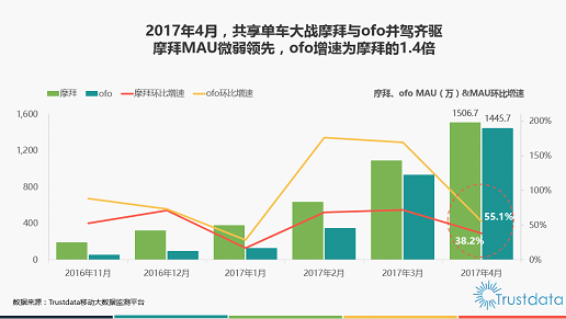 在共享單車行業競爭格局方面,Trustdata最新 4 月數據顯示:ofo4 月用戶環比增速高達55.1%,高于摩拜的38.2%,ofo月度用戶增速為摩拜的1. 4 倍,而且用戶增速已經是連續第 8 個月超越摩拜。在共享單車行業 4 月新增的 1200 萬用戶份額中,40.4%的新增用戶份額來自ofo,32.8%的新增用戶份額來自摩拜。總的來說,ofo在用戶增速、新增用戶份額方面穩居行業第一,成為了持續增長最快的共享單車平臺。