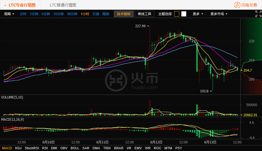 看火幣網(wǎng)萊特幣行情小時圖。昨日萊特幣跌幅-4.78%,主要受自前天上沖 228 元的天量成交量引起,上方壓力集聚,而后沖高無果,在高位形成圓弧頂,晚間出現(xiàn)較大的跌幅,最低跌至193. 8 元。早間出現(xiàn)必然程度的反彈,但反彈期間依舊無量,表白不是有效的反彈,更不是反轉(zhuǎn)行情的信號。上方壓力位 210 元,下方支撐 200 元。