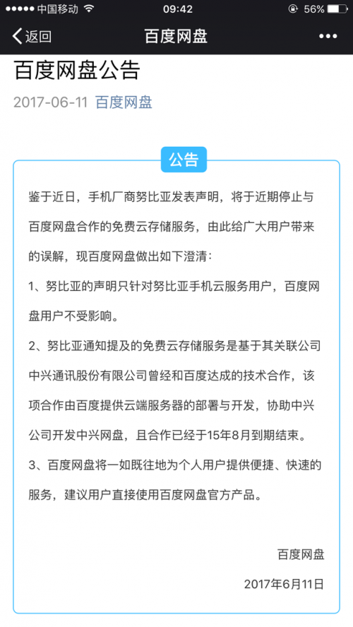 所以百度網盤在努比亞的聲明發出后,便緊急發出了澄清公告。聲稱努比亞的聲明只針對努比亞手機云辦事用戶,百度網盤不受影響。