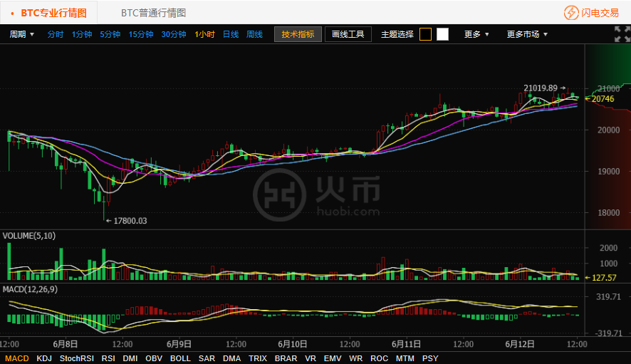 看火幣網比特幣行情小時圖。今日火幣網比特幣價格連續三次上沖至 21000 元歷史高點附近受阻回落,成交量沒有有效放大,,該位置將成為短期內重要壓力位。小時圖MACD再次呈現高位死叉,但死叉趨勢尚未形成。短期支撐依舊不才方平臺,位置為 20500 附近,尚未突破之前,短期暫時看作箱體震蕩行情?;饚啪W溫馨提示:投資有風險,入市需謹慎。