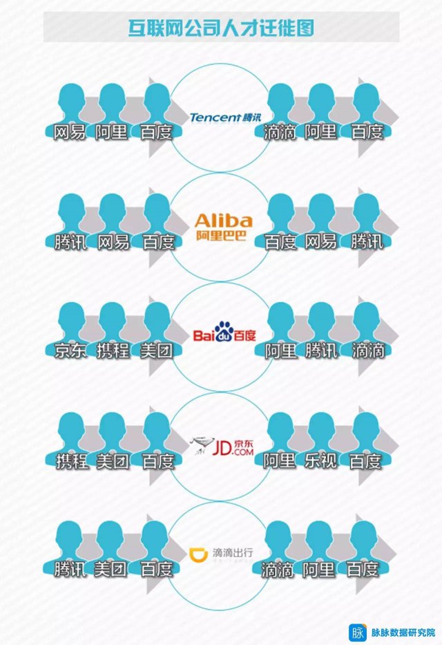 我們發現,比擬流去其他公司,BAT互跳更為頻繁。好比,百度和騰訊在為阿里輸送最多人才的公司中別離排第一和第三,,而騰訊又是阿里人跳槽最多的去處……