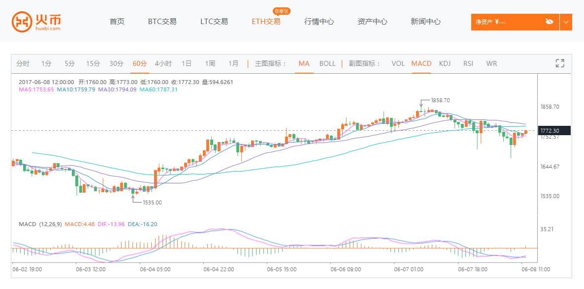 看火幣網以太坊行情小時圖。由于火幣網比特幣萊特幣均出現差別程度的下跌,導致火幣網以太坊價格跌幅3%,比擬其他數字資產,,火幣網以太坊跌幅較小。幣價在前期平臺 1700 元獲得支撐,但量能依舊不足,目前火幣網以太坊大周期的向上趨勢依舊沒有改變,在高位縮量橫盤有助于消磨上方產生的巨大壓力。MACD在低位重新形成金叉,表白多頭力量強于空頭力量。