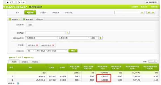 而來自業內市場調研機構艾瑞咨詢的數據則表白,在周度總使用次數這一關鍵數據上,ofo用戶的周度總使用次數為5892. 88 萬次,摩拜用戶周度總使用次數為4900. 15 萬次,比擬之下摩拜比ofo少了近 1000 萬次。這表白ofo用戶呈現更高頻的使用特性。