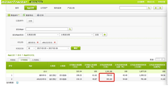 摩拜、ofo日均活躍用戶相差無幾,而在用戶日均總使用次數方面,ofo的841. 84 萬次,大大高于摩拜的700. 02 萬次。