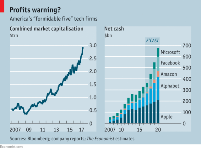 科技公司的價值高估曾經被視為瘋狂的征兆。而如今的投資者認為,他們做出的判斷非常冷靜——這些科技公司是 21 世紀的主要寡頭壟斷企業,將會獲得巨大的、節節高升的利潤。然而,一個疑慮仍然令人不安:這五大科技巨頭的資產負債表上有大量現金,給人的感覺好像是它們并不想主宰世界,而是預計會有危機發生,想要未雨繆綢。