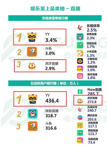 在本次極光大數據 4 月榜單中,YY以3.4%的市場滲透率穩坐直播領域的第一寶座,同屬歡聚陣營的虎牙直播則以2.9%的微弱差距位列第三。值得注意的是,虎牙直播的滲透率始終連結著較快的增速,大有向YY直播挨近的勢頭。