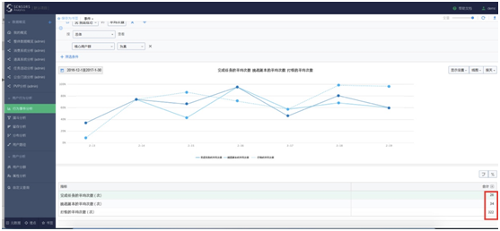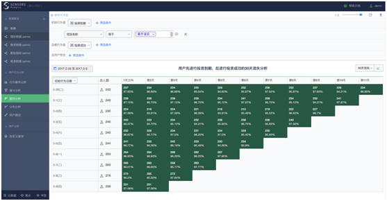 如電商客戶、互聯網金融包羅用戶認證身份信息、手機號碼、充值賬戶信息等數據,前端數據無法進行深入分析。再如,在互聯網金融企業,最大痛點莫過于揪出“羊毛黨”了。“羊毛黨”手里握著大量的代理IP、手機虛擬號。這一群體特征十分明顯,通常是經過注冊、領取福利、流失。這就需要運營人員從IP、設備信息、注冊信息、活躍度等進行多維度分析。用戶留存是互聯網金融企業判斷客戶是否是“羊毛黨”的方式之一。如圖4,在神策分析平臺上,一般用戶完成新手項目(領取福利后),未進行第二次投資,則可能是“羊毛黨”成員,在該平臺上點擊相關數字,人員明細會詳細展示出來。