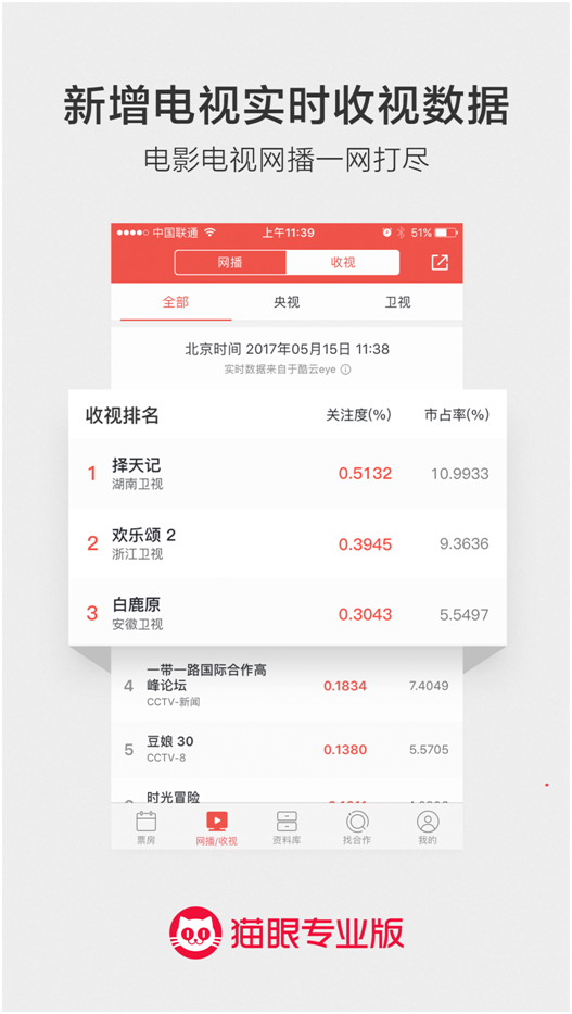 貓眼電影專門為影視行業提供數據辦事的專業工具貓眼專業版,在近期新推出了實時數據收視監測功能,則可以對央視和各大衛視熱播的劇集、綜藝、新聞等節目收視數據進行實時監測和更新,并且這次貓眼和與收視大數據監測機構酷云EYE進行合作,依托貓眼大數據及酷云EYE超過1.2億終端覆蓋(終端包孕智能電視機和機頂盒),通過海量終端的數據回傳,實時匯總統計各種各樣的數據,并拒絕一切報答干擾因素(即拒絕人工干預、拒絕數據過濾、拒絕數據樣本化),最大程度保證數據的真實性、有效性和透明性。