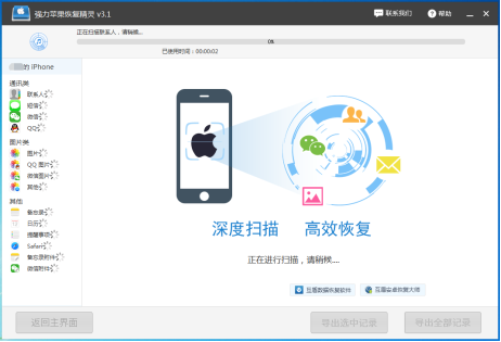 5.掃描完成后,在軟件左側可以看到聯系人、短信、微信等。右下角別離是“導出選中記錄”和“導出全部記錄”。