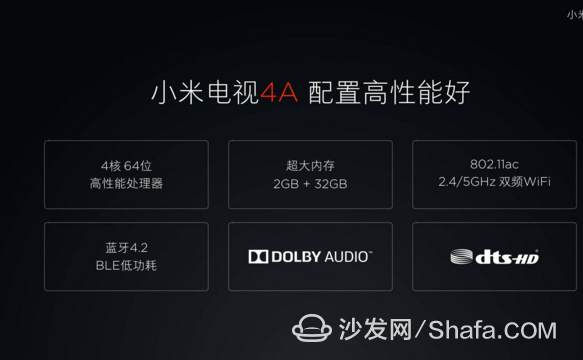 小米電視4A系列各尺寸統一采用了晶晨AmlogicT962CortexA53 處理器( 4 核高性能CPU,主頻高達1.5GHz),和Mali-450MP5750MHz的GPU( 5 核高性能GPU)、2GBDDR4 高速內存,同時標配8GeMMC5. 1 高速閃存,還可選配32G超大閃存版本。