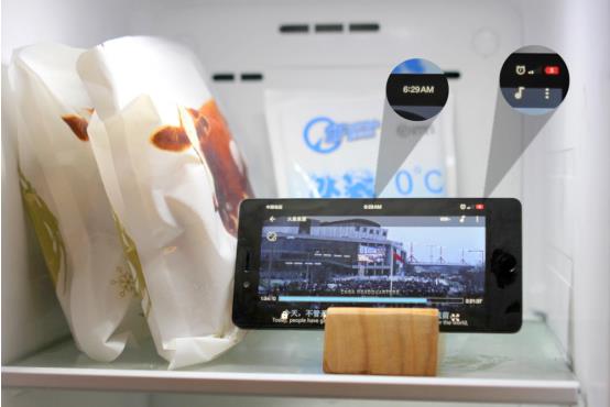 清晨, 5 點(diǎn)半,天色微蒙,打開(kāi)冰箱門(mén)查看手機(jī)狀況,視頻依舊在繼續(xù)播放,剩余電量?jī)H余5%!并且整個(gè)手機(jī)包裹著一層薄薄的冰霜。(如下圖所示)