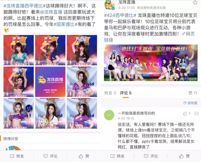 盡管美女營(yíng)銷已經(jīng)成了如今各類會(huì)展、活動(dòng)的常見(jiàn)手段,但是過(guò)度使用非但達(dá)不到效果,反而會(huì)像龍珠一樣惹得一身腥。或許龍珠最初的想法是通過(guò)這些自帶粉絲的美女主播幫體育頻道導(dǎo)量,但這些美女自己不是足球解說(shuō),起碼從口碑上看,并沒(méi)有起到應(yīng)有的宣傳效果。