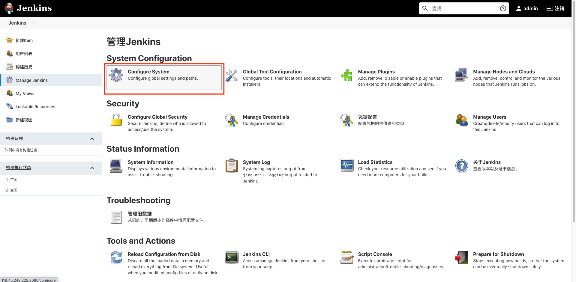 安裝完成之后,選擇左側Manage Jenkins選項。如下圖所示: