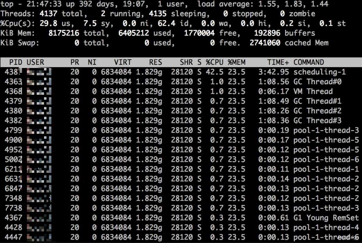 經歷上述過程,往往已經可以定位到大量消耗CPU的線程及bug代碼,比如死循環。但對于該案例:Java進程占用的CPU是961.6%, 而“scheduling-1”線程只占用了42.5%的CPU,那其它CPU被誰占用了?