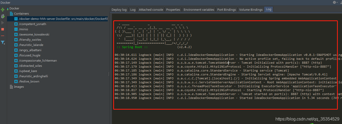 Bind mounts : 將宿主機(jī)目錄掛到到容器內(nèi)部目錄中。格式為[宿主機(jī)目錄](méi):[容器內(nèi)部目錄](méi)。這個(gè)springboot項(xiàng)目會(huì)將日志打印在容器