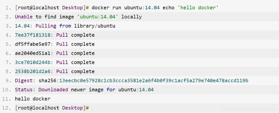 [root@localhost Desktop]# docker run --name testcontainer ubuntu echo 'hello docker'