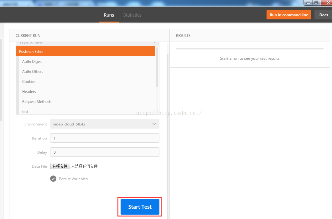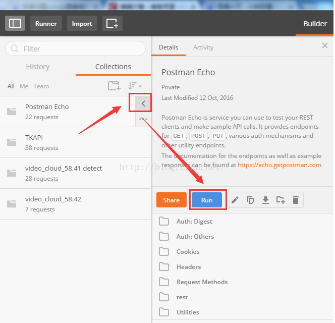 最后我們再來看看POSTMAN的批量執行功能,這個功能由單獨的runner來負責的,我們需要在另外的界面進行操作,具體如下: