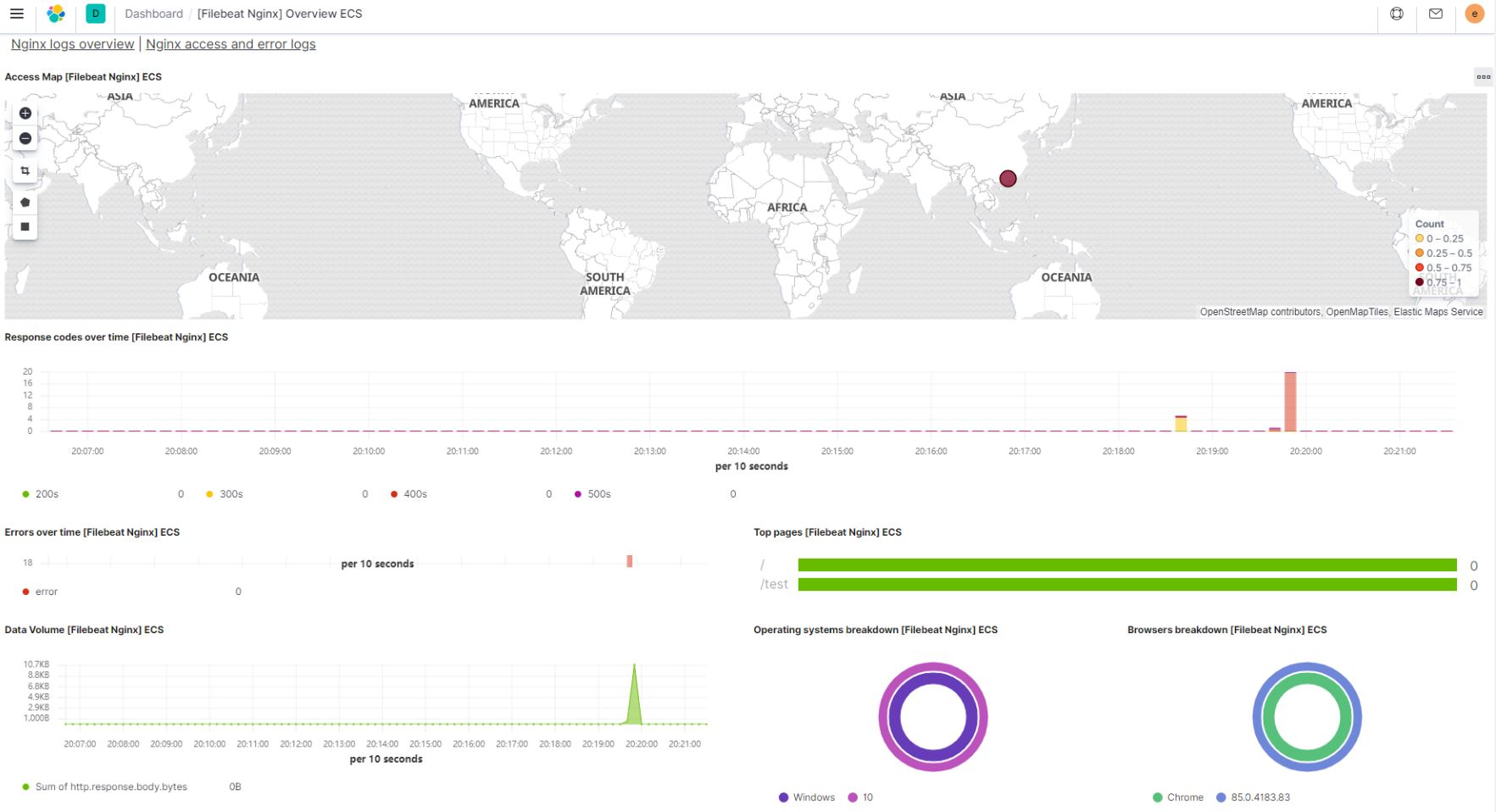 涉及到 Elastic Stack 中 Filebeat 是用于采集 Nginx 相關(guān)的日志, Elasticsearch 是用于對(duì)于數(shù)據(jù)落地存儲(chǔ)和搜索的引擎, Kibana 是用于對(duì)數(shù)據(jù)可視化的工具。