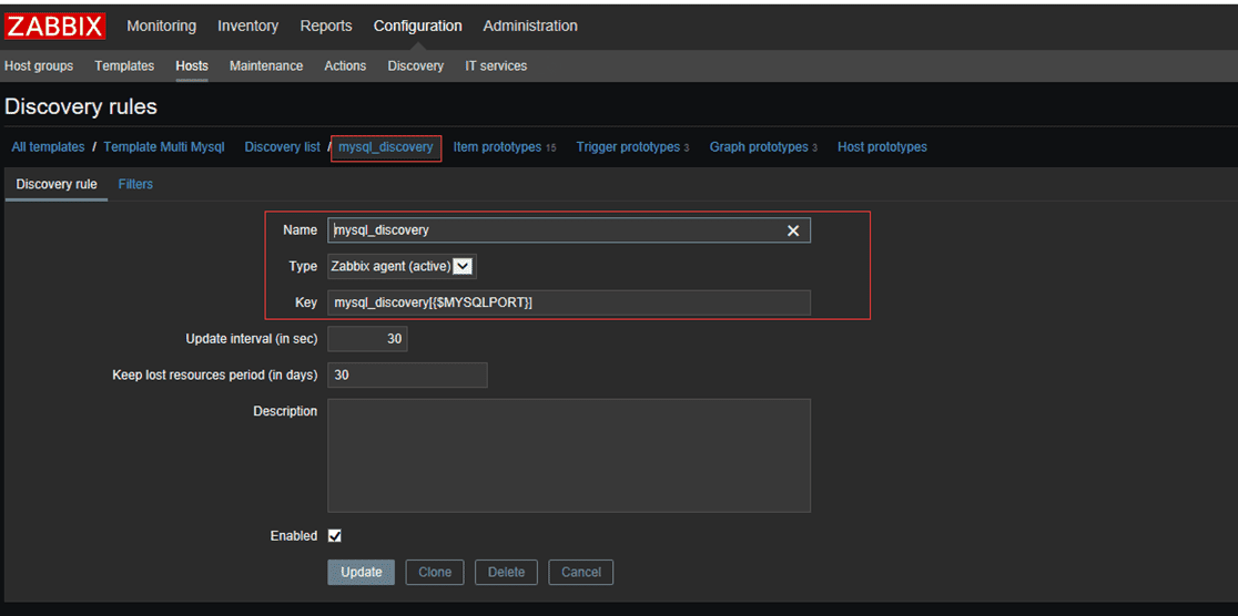 UserParameter=mysql_discovery[*],/etc/zabbix/bin/discovery_mysql.sh $1 ###自動發(fā)現(xiàn)不同端口