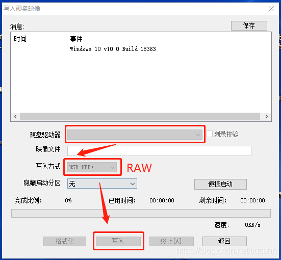 步驟三、選擇對應的優(yōu)盤,寫入方式選擇RAW,然后點擊“寫入”,等待完成。可能需要等待一段時間,請不要著急。