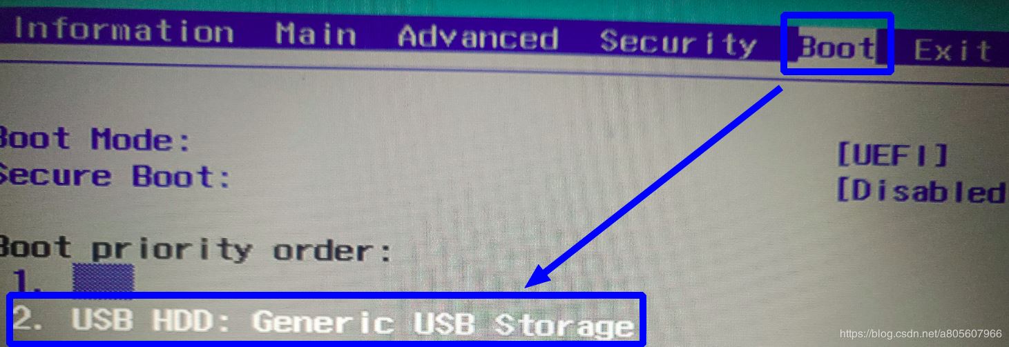將制作為啟動盤的U盤插入要安裝ubuntu20.04的電腦,重啟電腦,在系統加載好之前進入BIOS系統(要在出現電腦當前系統歡迎界面前按F2或F12之類的,不同電腦的按鍵不一樣,有的會顯示在啟動界面的最下方一行文字提示里;可以上網查自己的電腦型號對應的進入BIOS的按鍵,或者同時狂按F2和F12試試看)。進入BIOS后,用鍵盤左右方向鍵切換到Boot頁(不同電腦的BIOS系統不一樣,可能操作也會不一樣),然后按上下方向鍵選定到USB HDD那一行,就是我們插到電腦上的USB啟動盤了。