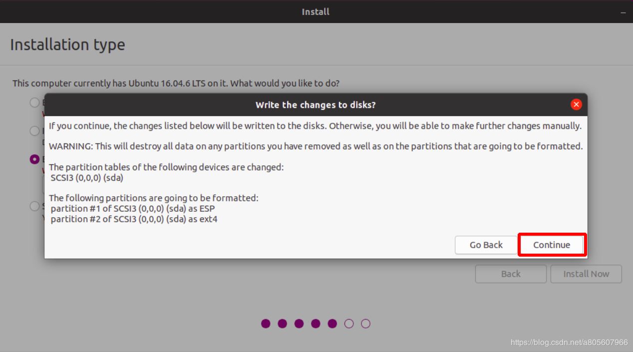 會彈出確認界面顯示磁盤變動,確認電腦上的文件都已經備份后,點擊Continue開始安裝。