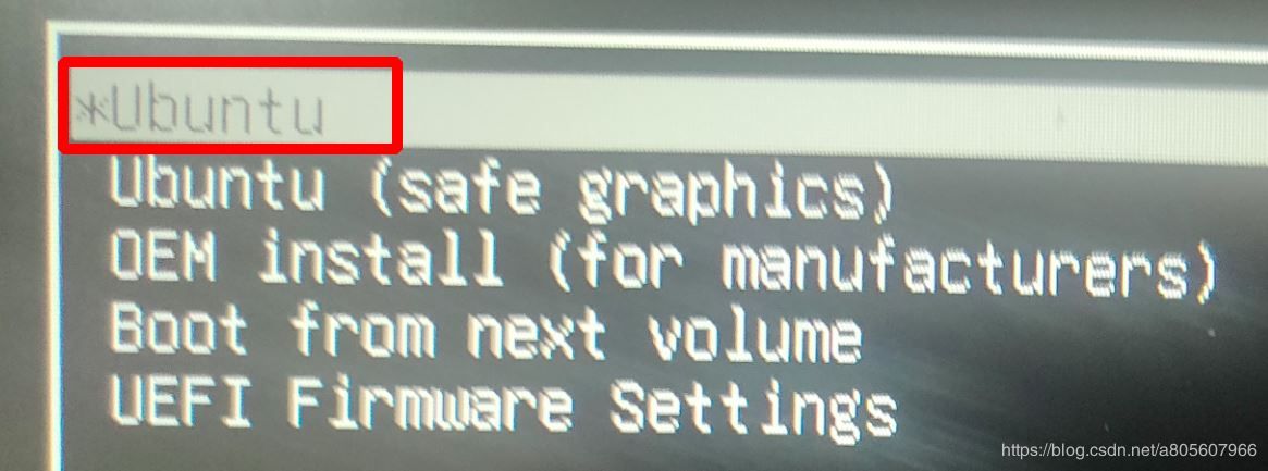 系統自動重啟,然后進入啟動選擇界面。直接用默認的第一行選項Ubuntu,按回車即可(這個界面只停留幾秒,沒作出操作會自動選擇當前光標所在項啟動)。