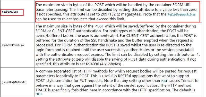 查看相關屬性,我們就會看到maxPostSize的詳細介紹,這個限制必須設置為小于0的負數才能不限制,缺省下是2097152,也就是2M的大小,單位是Byte。