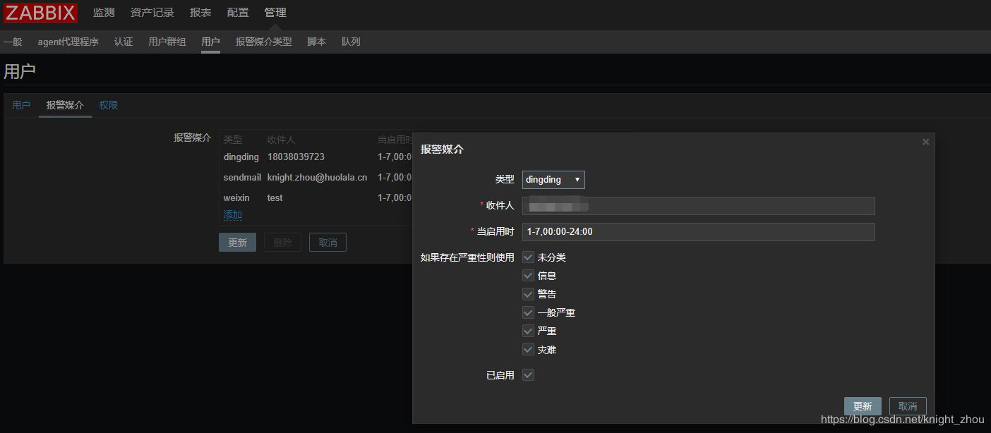 配置--->用戶---> 報警媒介,把釘釘加進來即可。 其中收件人要寫自己的電話號碼。