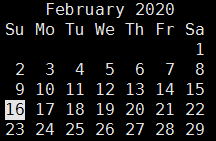 可指定 YEAR(1-9999)、MONTH(1-12)和 DAY(1-31)。不跟任何選項(xiàng)和參數(shù)單獨(dú)執(zhí)行 cal,顯示當(dāng)月月歷。