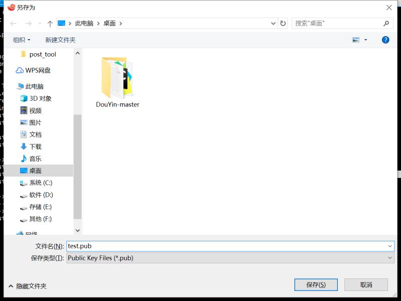 然后選擇保存文件,將公鑰信息保存下來,這里我保存為test.pub,保存后單擊完成(xshell會自動記錄test。pub)
