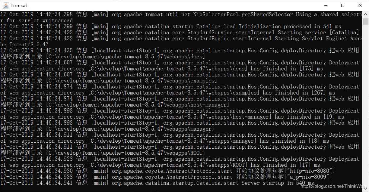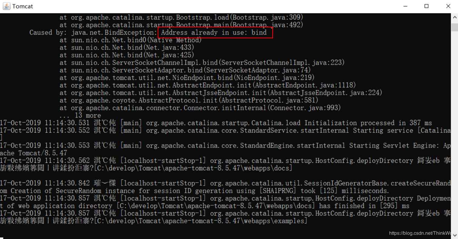 最正確的方法是查看日志,找到Tomcat目錄下的logs目錄中catalina當天的日志,我這里找到的是C:\develop\Tomcat\apache-tomcat-8.5.47\logs\catalina.2019-10-17.log,在日志中可以看到類似這樣的輸出,Address already in use: bind說明是端口占用了
