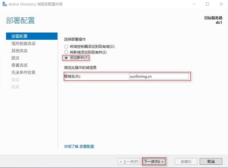 2)因為是第一個AD控制器,點添加新林,根域名處填域名sunliming.cn,點下一步