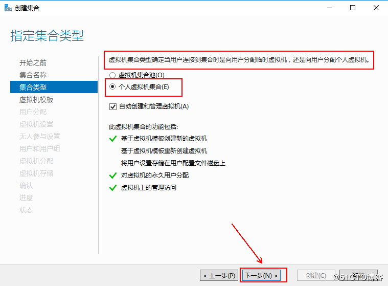 4、在“指定集合類型”如果采用每個用戶專有虛擬桌面,可選中“個人虛擬機集合”,然后單擊下一步,反之,可選擇“虛擬機集合池”,這里可根據實際需求來定義: